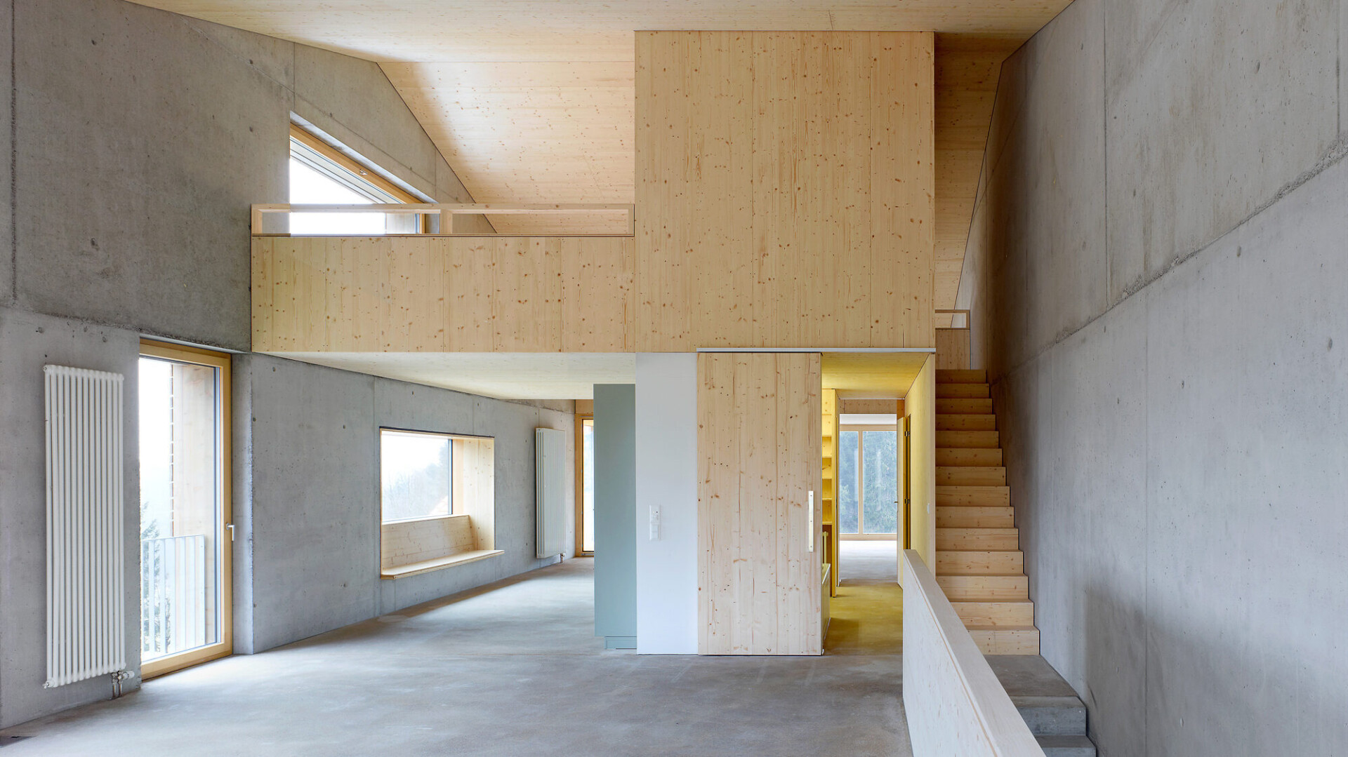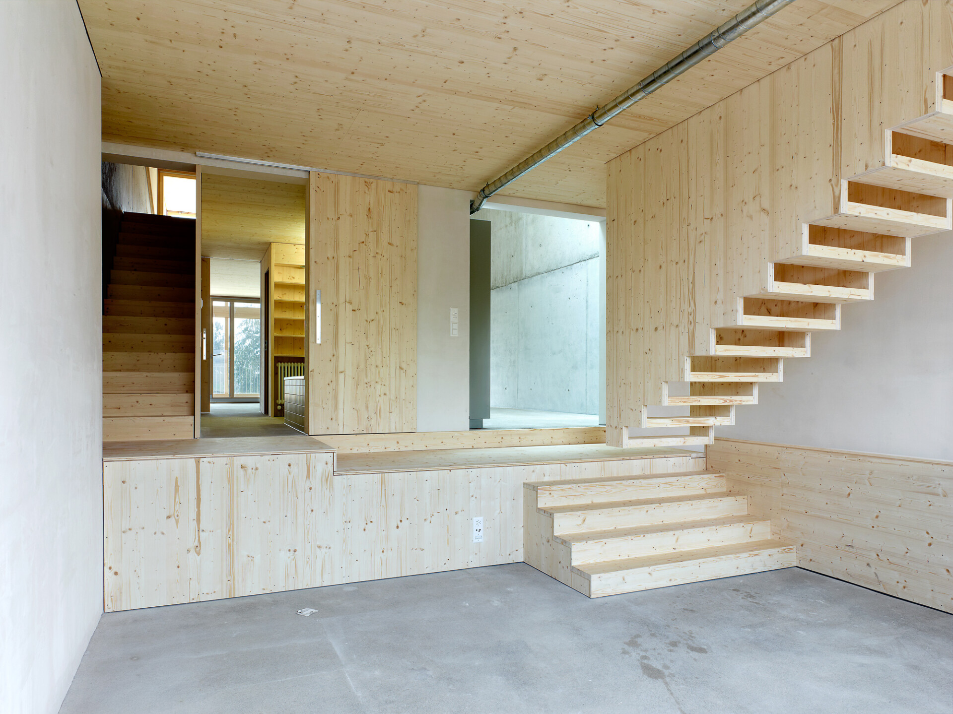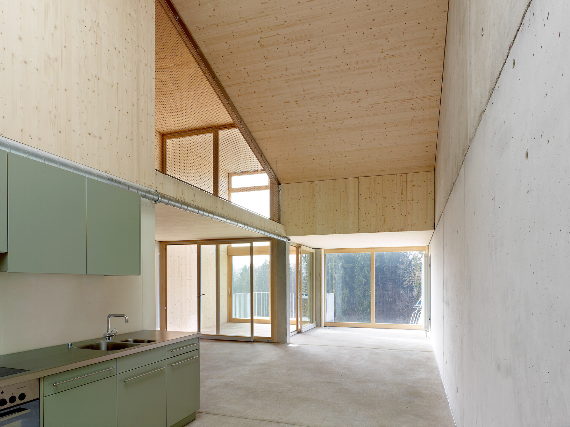 Minergie P Standard: Die konsequente Systemtrennung Rohbau-Haustechnik-Ausbau bestimmt das Materialkonzept. Die Konstruktion bildet zugleich die Oberfläche. Wohnungstrennwände und Geschossdecken in Beton sowie Fassade und Dach in unverkleideter Holzrahmenbauweise erzeugen die Raumstimmung. Mit kontrollierter Wohnungslüftung, solarer Warmwasseraufbereitung, kompaktem Volumen und passiver Sonnennutzung ist der Bedarf an zusätzlicher Energie sehr gering und der Minergie P Standard erreicht.
