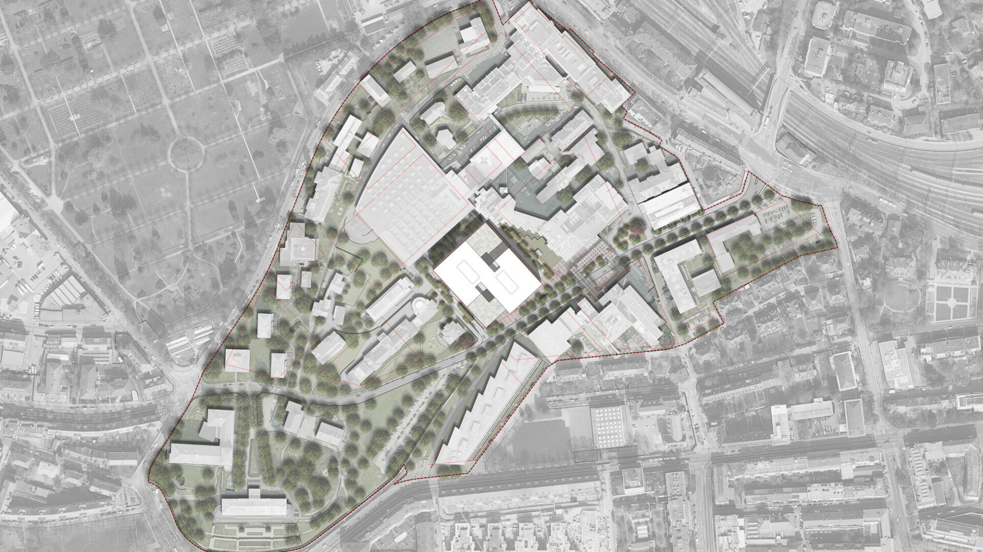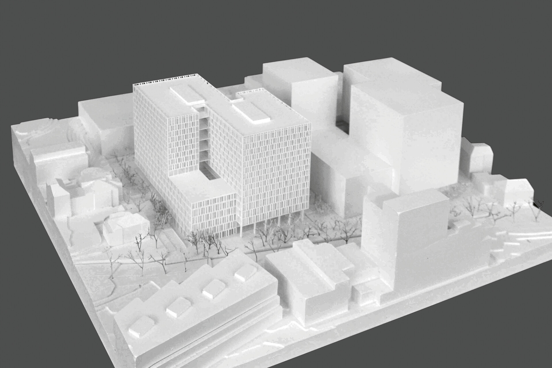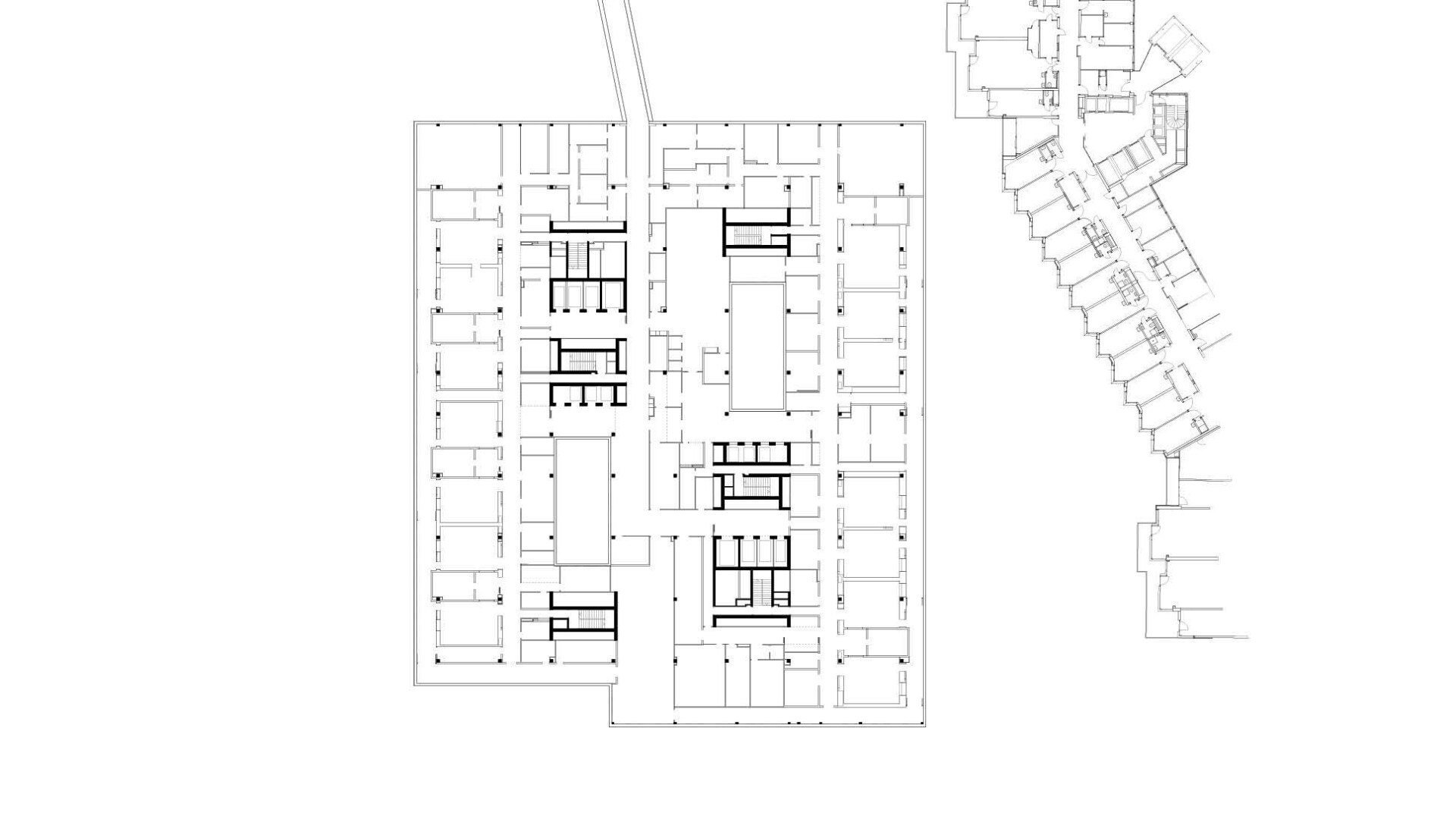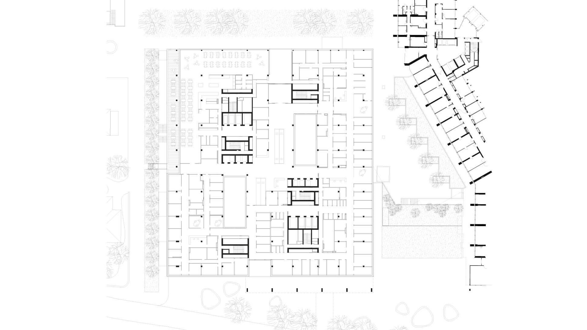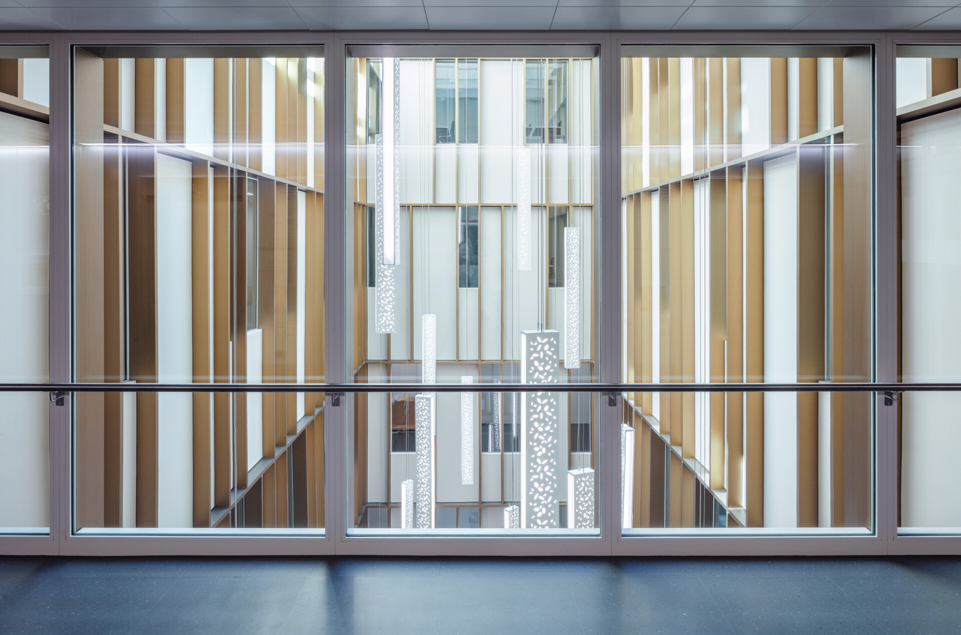 Das Gebäude gibt eine einfache Antwort auf eine komplexe Aufgabenstellung. Dank der klaren Gebäudestruktur mit zwei Haupterschliessungskernen und zwei Innenhöfen kann sich der Besucher bereits beim Eintreten in das Gebäude gut orientieren. Das Zentrum des Grundrisses wiederholt sich auf den meisten Geschossen und erleichtert so die Orientierung. Die gute Orientierung im Gebäude bleibt Hauptthema und ist auf allen Ebenen gewährleistet.