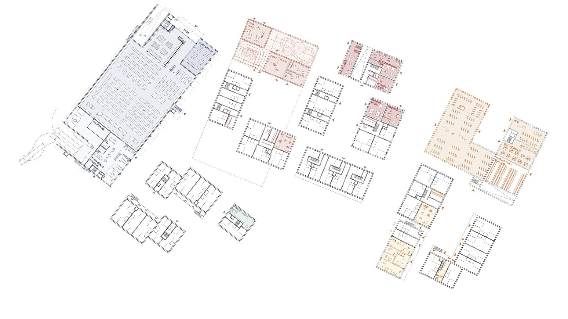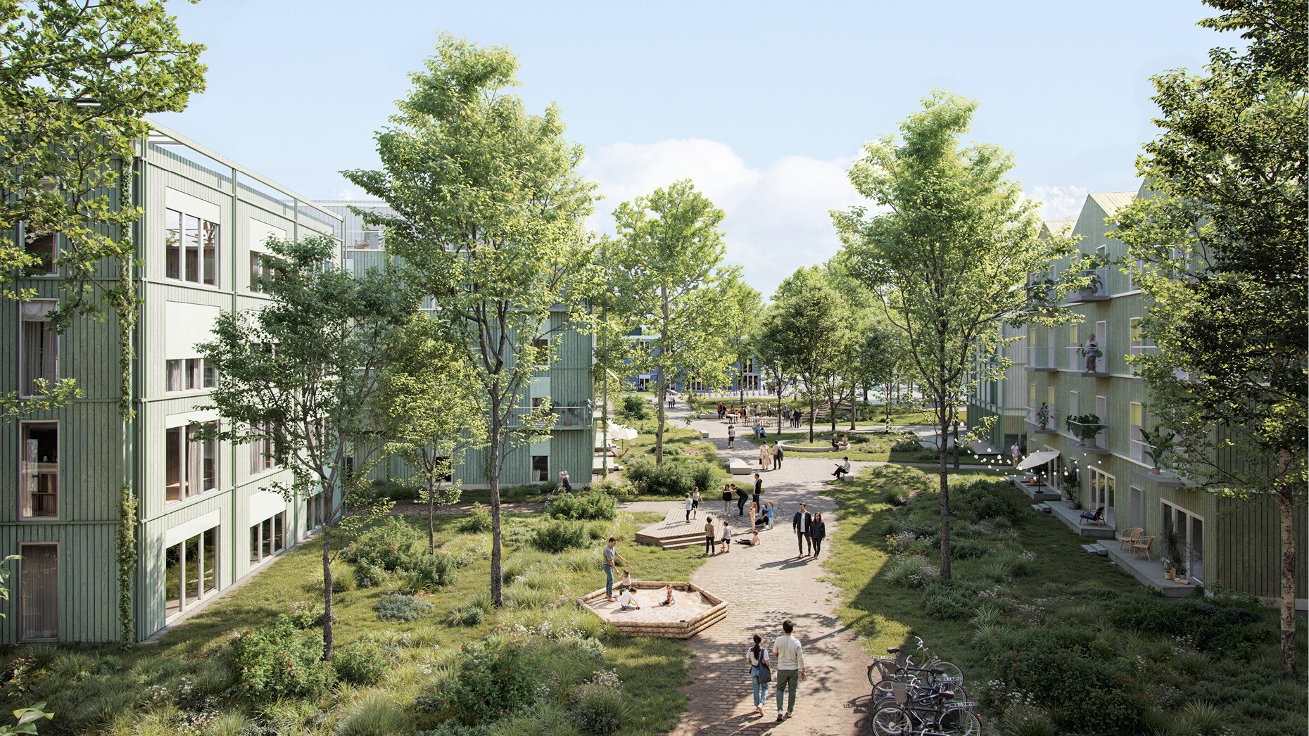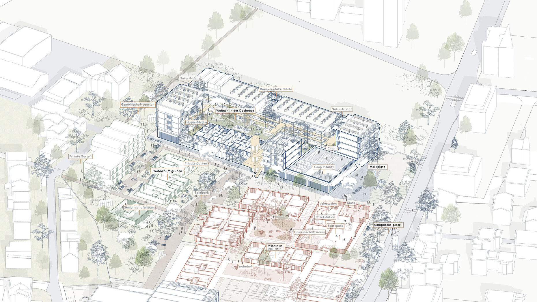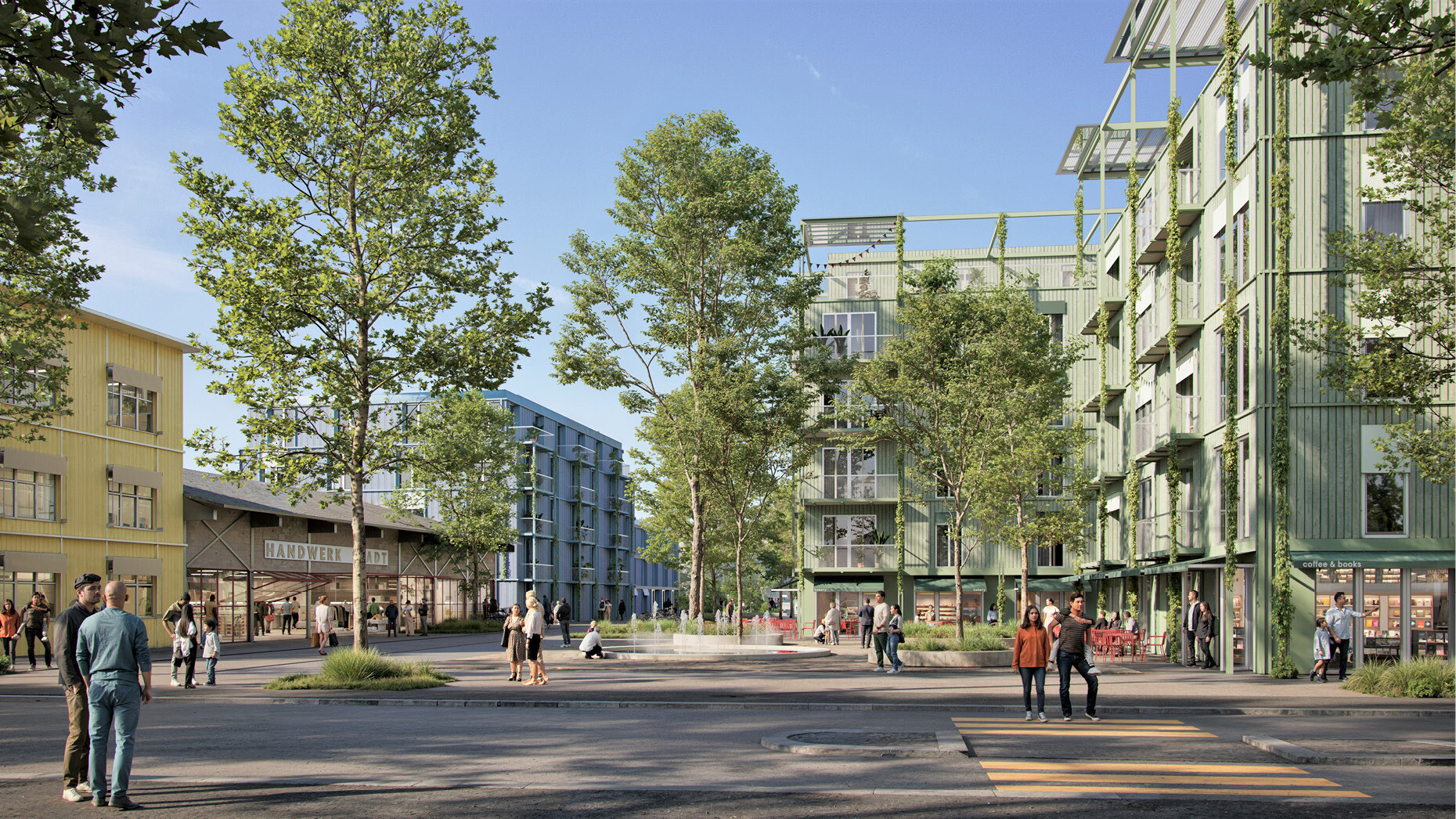 Die gemischten Nutzungen innerhalb des Quartiers reagieren flexibel auf die unterschiedlichen Bedürfnisse der Bevölkerung und ermöglichen vielfältige Programme. Unterschiedlich ausgestaltete Freiräume – darunter gemeinschaftliche Gärten, ein Spielpark und nutzungsoffene Höfe – schaffen Aufenthaltsqualität, fördern soziale Interaktionen, tragen zur Biodiversität bei und stärken die klimatische Resilienz des Quartiers. Aktiv genutzte Erdgeschosse mit publikumsorientierten Angeboten beleben den öffentlichen Raum, während ein zentraler Marktplatz als sozialer Treffpunkt dient und die Quartiersidentität stärkt.