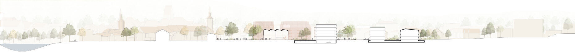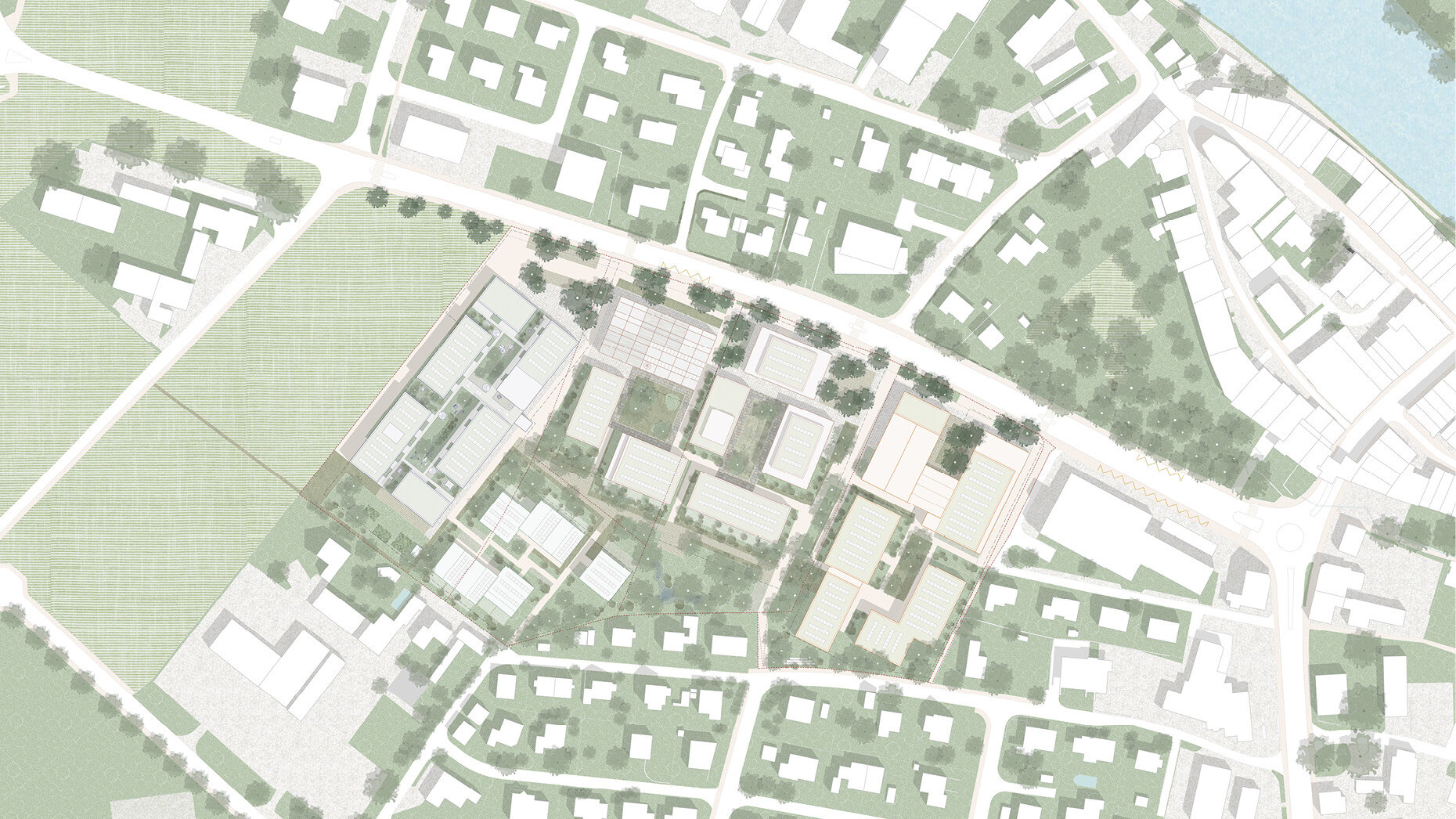 Die Zentrumszone an der Birrfeldstrasse in Mellingen wird zu einem durchlässigen, lebendigen und grünen Stadtbaustein transformiert. Das Areal verbindet zentrale städtebauliche Achsen – vom historischen Zentrum über Schul- und Freizeitanlagen bis hin zum angrenzenden Landschaftsraum – und schafft damit ein neues, gut vernetztes Quartier mit zukunftsgerichteter Entwicklungsstrategie. Am östlichen Ortseingang der Stadt entsteht ein vielfältig nutzbarer Lebensraum mit räumlicher Offenheit, der sich in vier eigenständige Nachbarschaften gliedert. Diese bieten ein breites Spektrum an Wohnformen, vom zurückgezogenen Wohnen im Grünen bis hin zu gemeinschaftlich genutzten Dachflächen.