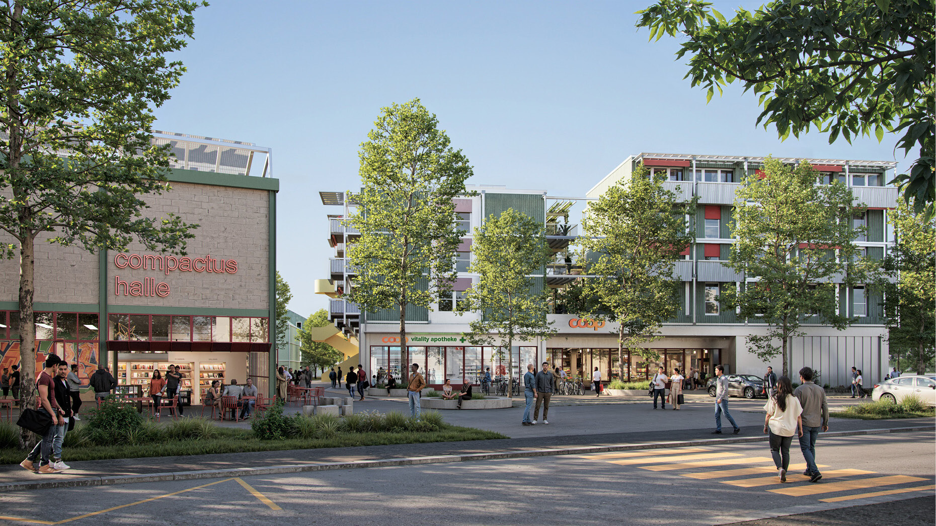 Ein zentraler Baustein der Entwicklung ist das ehemalige Coop-Areal. Hier ist ein Ersatzneubau geplant, der einen grossflächigen Supermarkt im Erdgeschoss mit Wohnungen in den darüberliegenden Geschossen kombiniert. Eine vorgelagerte Platzfläche schafft eine einladende Adresse an der Birrfeldstrasse und formuliert den Übergang zwischen Stadt und Landschaft. Als neues Aushängeschild des Quartiers übernimmt das Gebäude eine städtebaulich prägende Rolle und markiert den Auftakt zu einem lebendigen und zukunftsweisenden Quartier.