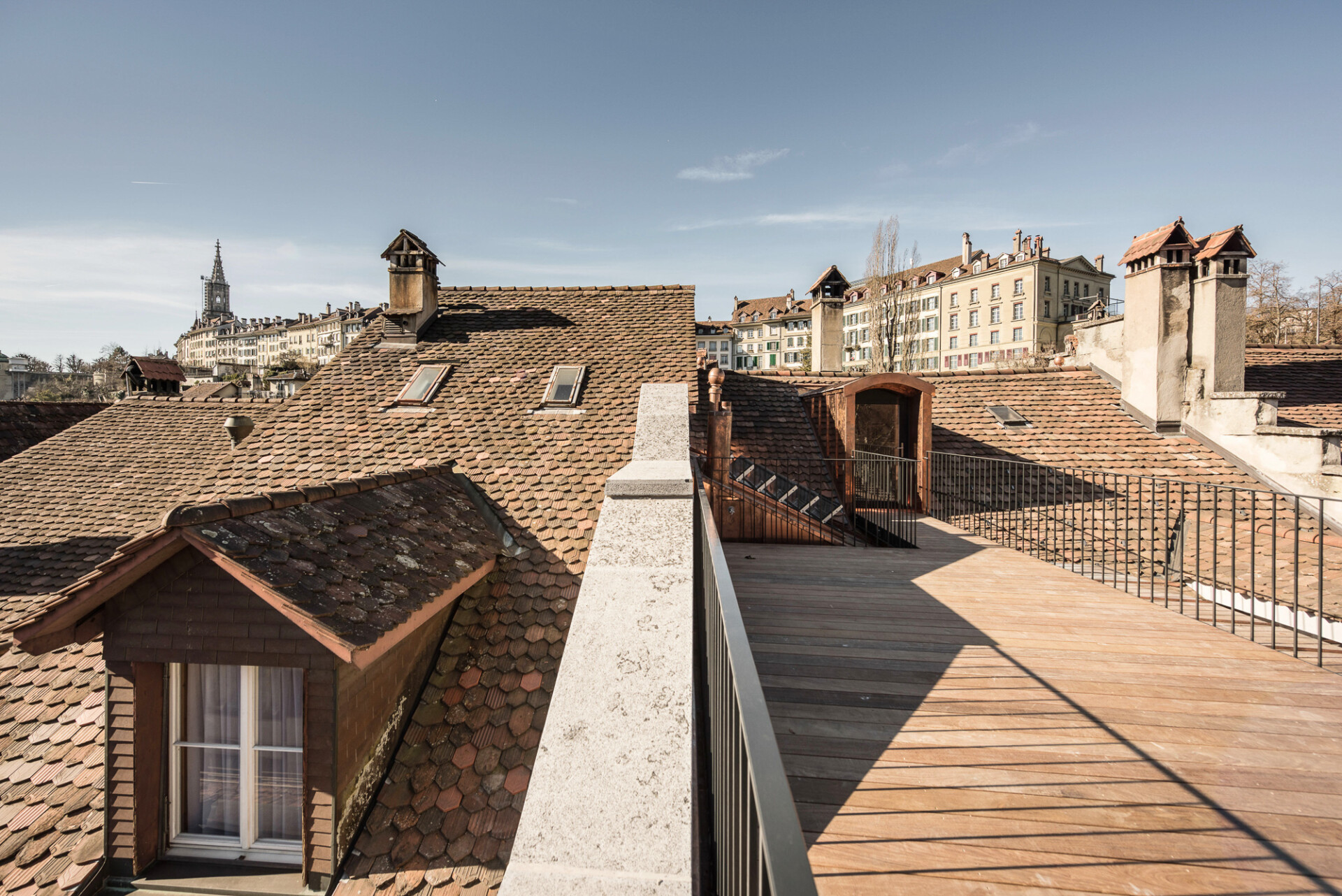 Die Warmwasseraufbereitung und Heizung befindet sich nach drei Hochwasserkatastrophen neu im Dach. Eine 30 Quadratmeter grosse Dachterrasse ist in die Dachlandschaft integriert und bietet einen phänomenalen Ausblick auf Berner Münster, Bärengraben und Nydeggbrücke.