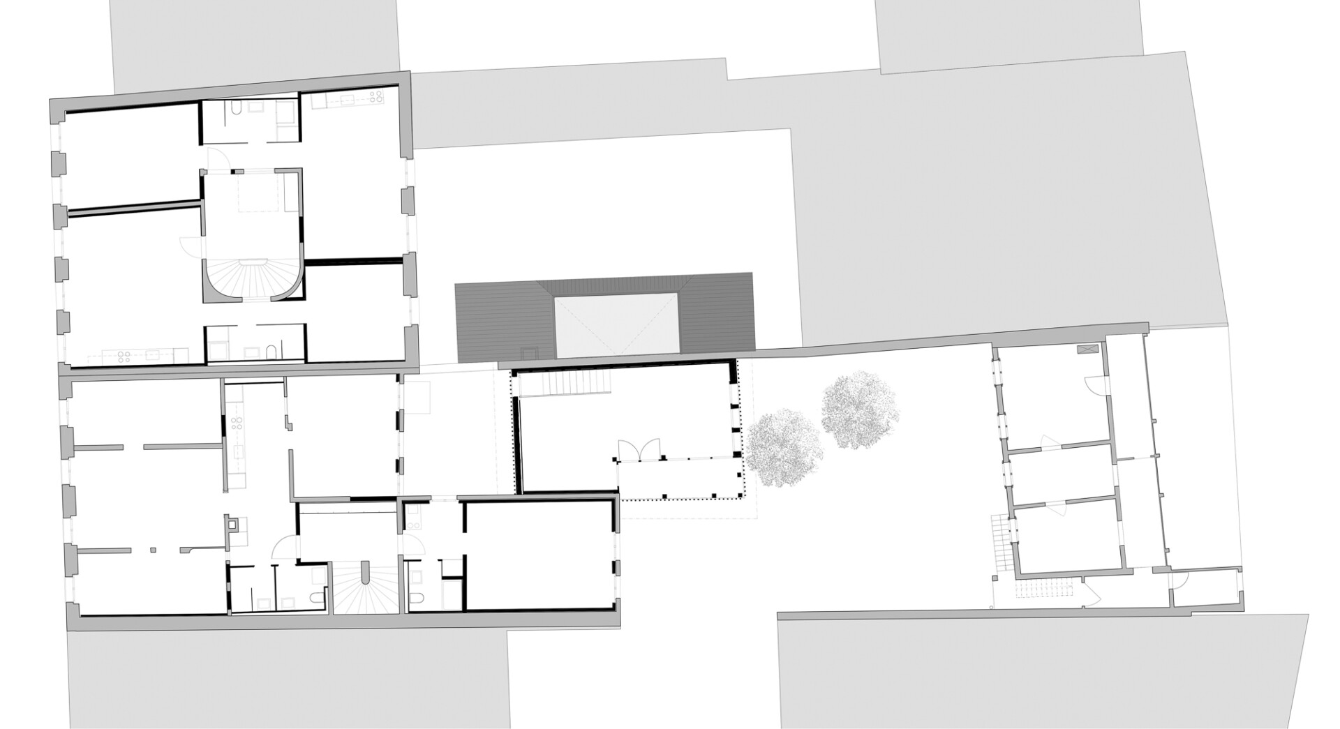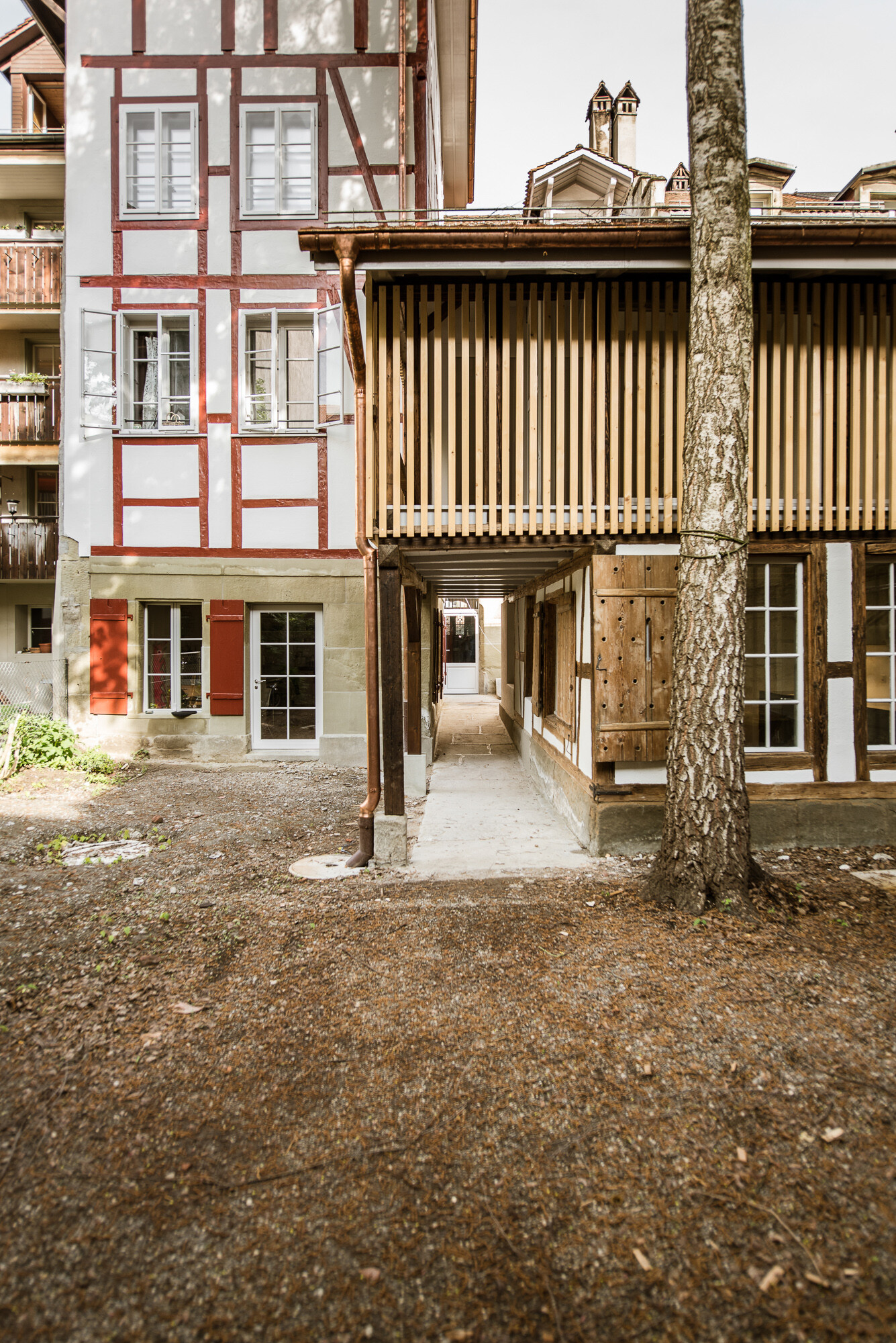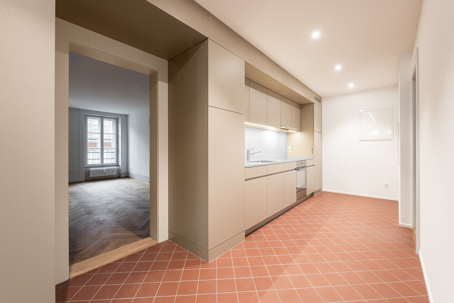 Sanfte Sanierung: Die Läden im Erdgeschoss der Vorderhäuser bleiben erhalten. Darüber liegen 2,5 und 4-Zimmer Wohnungen sowie drei Studios. Ein 2-geschossiges Wohnatelier ersetzt das Waschhaus im Hof. Die Fassadenfenster werden in den aufgearbeiteten Rahmen mit Isolierglas wärmetechnisch verbessert. Küchen und Bäder werden komplett saniert und auf moderne Bedürfnisse abgestimmt.