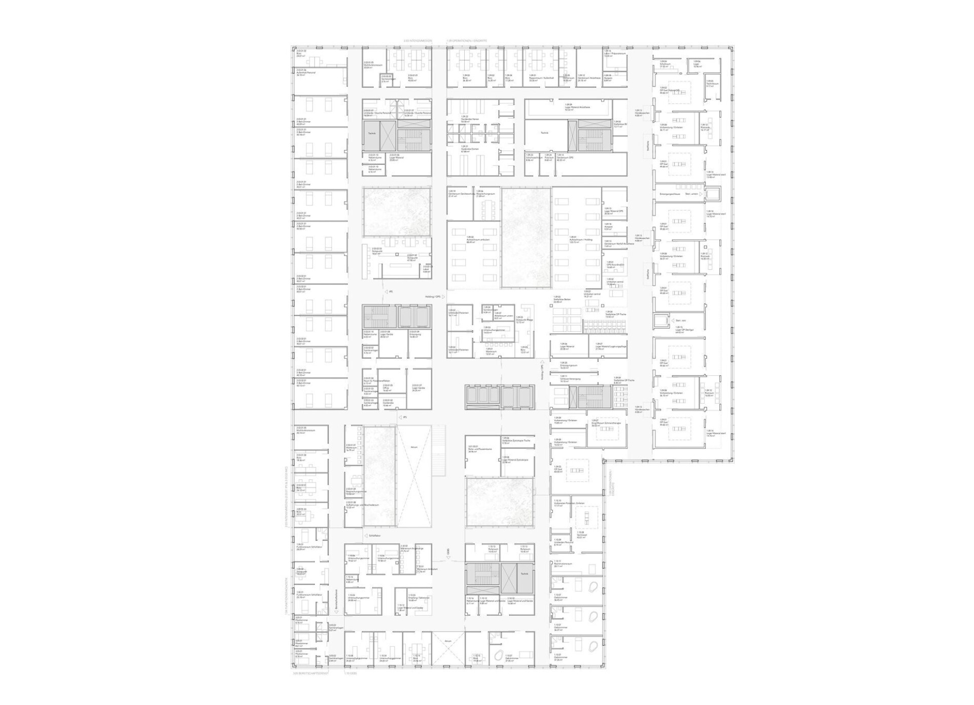 Mit der Positionierung des neuen Spital­gebäudes am östlichen Rand der Lichtung möchten wir dem Ort seine Ruhe und Wertigkeit zurückgeben. Unter der Massgabe, einzig das ur­sprüngliche Kantonsspital lang­fristig zu erhalten und zugleich Teile des Baumbestandes zu reduzieren bzw. zu konzentrieren, ergibt sich die Chance, die besonderen Qualitäten des Stand­ortes in seine Grundstruktur zurück­zuführen, die Blick­beziehungen innerhalb der Lichtung zu weiten und wieder mehr freien Raum für das Spital zu gewinnen.