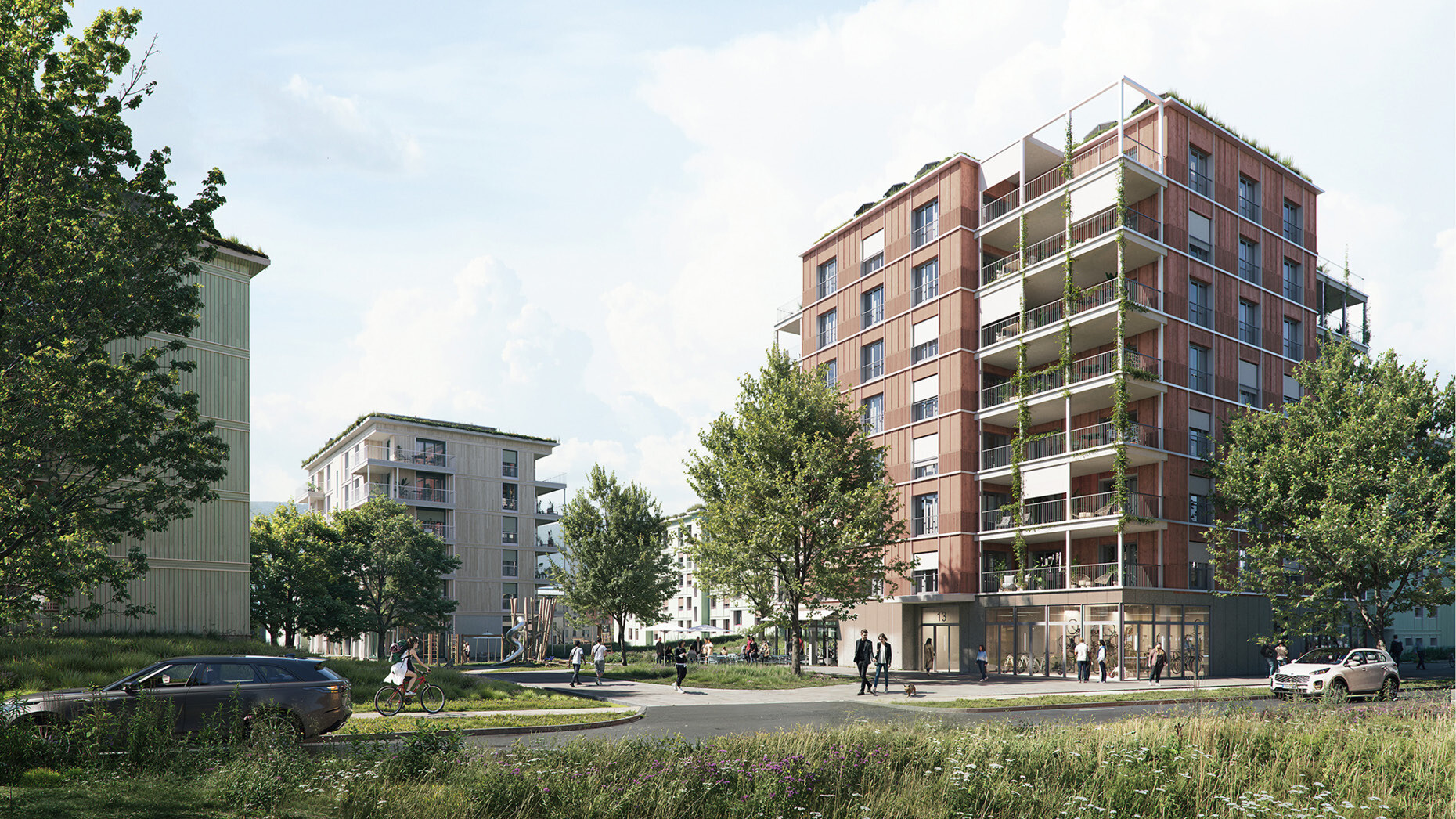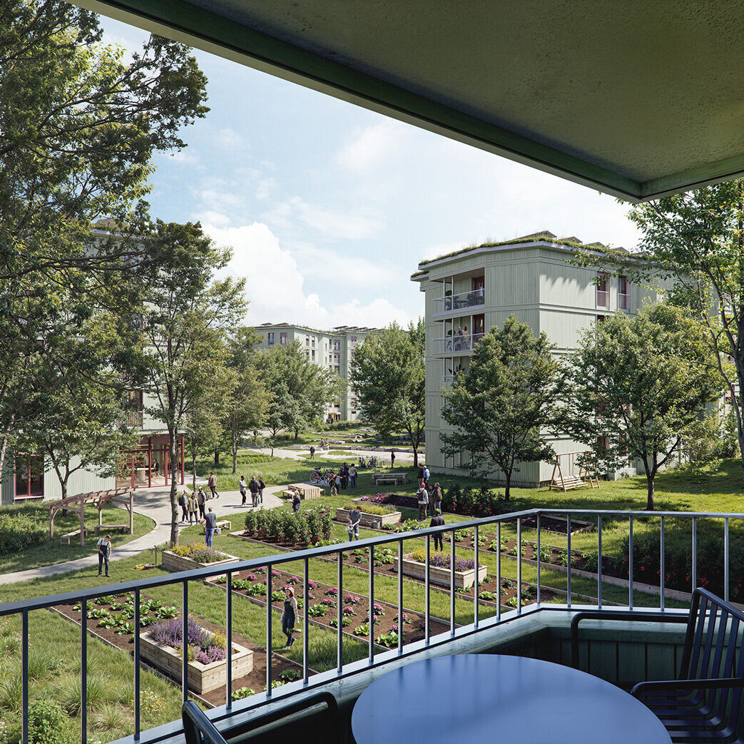 Der neue Punktbau an der Jurastrasse nimmt eine wichtige Rolle in der Hierarchisierung des Wegnetzes ein. Das Gebäude und der umliegende Platz bilden die neue Hauptadresse. Etwas zurückhaltender begleiten drei unterschiedliche Vorplätze die neuen Kopfbauten entlang des äusseren Ringes. Sie offerieren altersübergreifende Begegnungs- und Spielräume, wobei sie stark mit dem Innenleben der Architektur interagieren. Flexible Grundrissstrukturen mit einfachen statischen Prinzipien eignen sich optimal für innovative, nachhaltige Holzbaukonstruktionen.