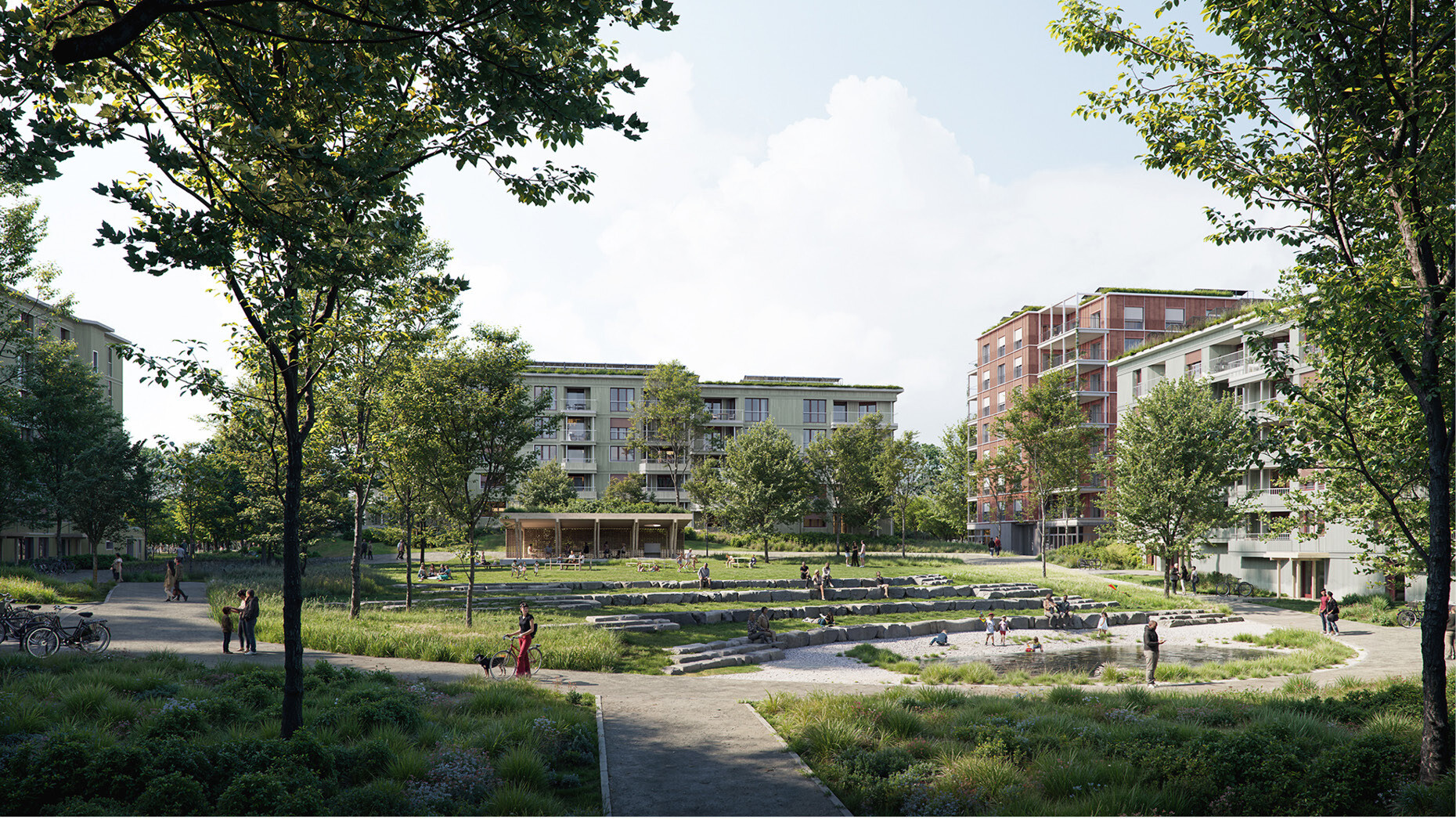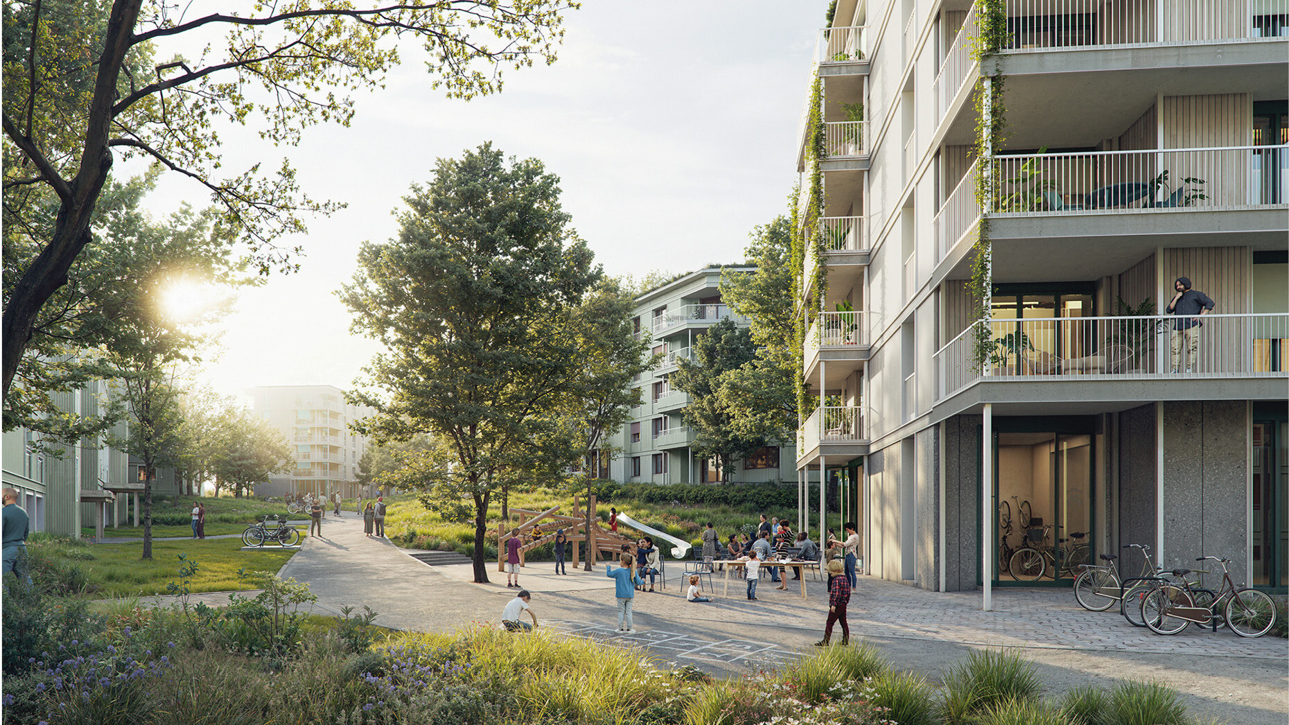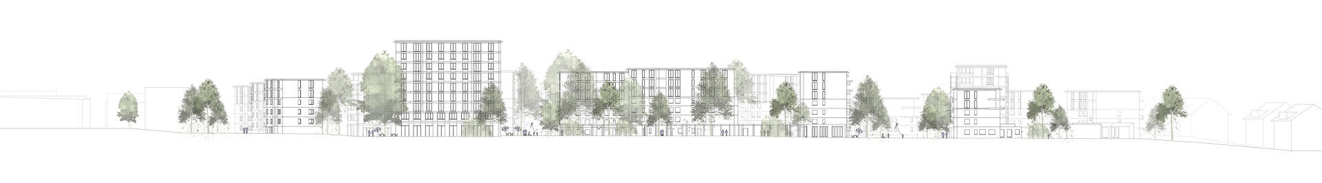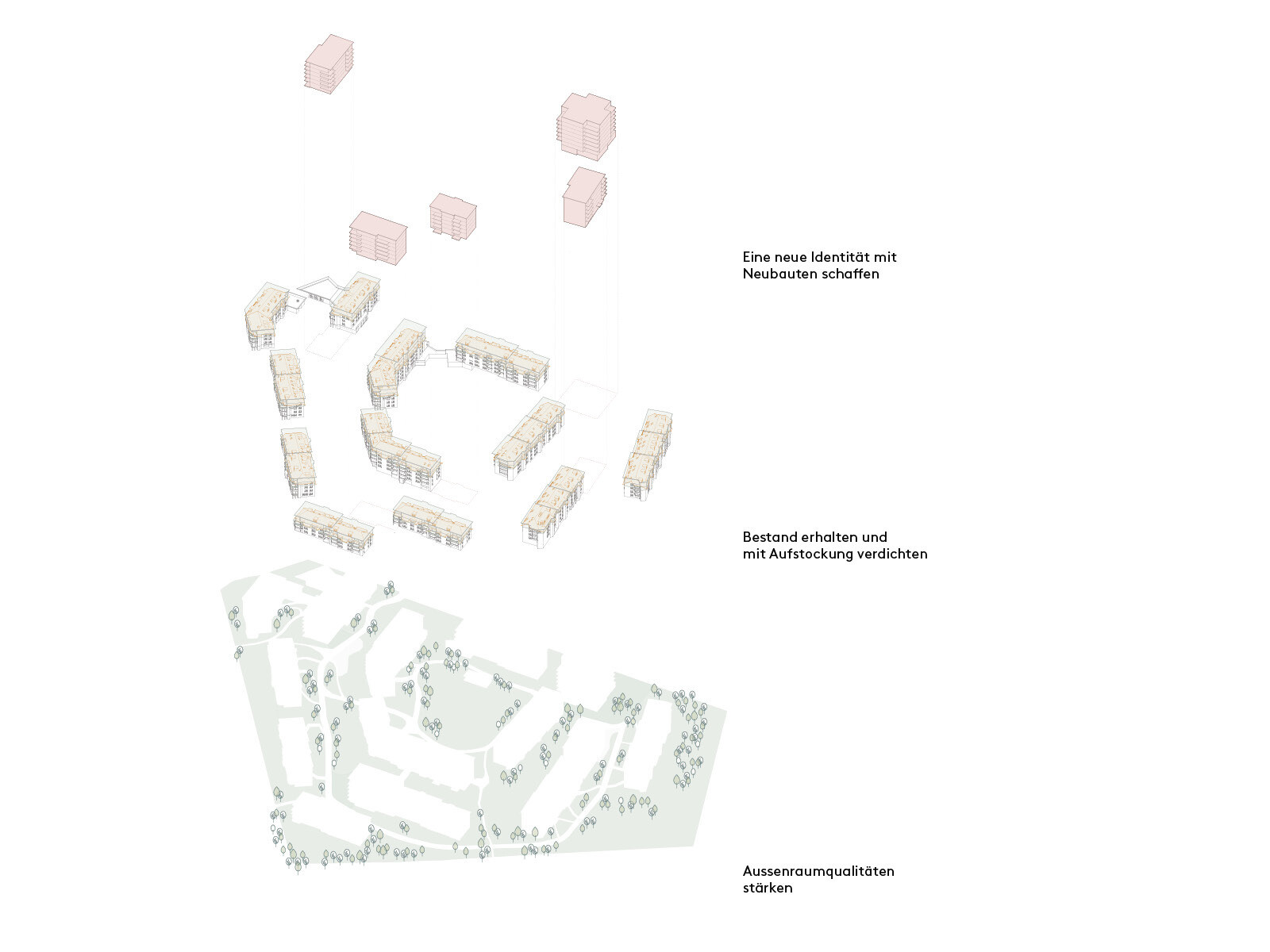 Ein hoher Grad an Durchwegung und Vernetzung sorgt für kurze Distanzen und aktiviert die Zirkulation. Der Reichtum an unterschiedlichen räumlichen Konstellationen fördert Orte für vielfältige Wohn- und Begegnungsformen. Die neuen Identitäten mit spezifischen Atmosphären dienen dazu, der heutigen Homogenität entgegenzuwirken. Die Schwellenräume und Vorzonen regulieren das Verhältnis zwischen öffentlich und privat. Unterschiedliche Höhen, Körnungen und vertikale Schichtungen erzeugen einen differenzierten Massstab und steigern die Identifikation. Die Mischung von sozialen Milieus, Altersgruppen und Nutzungen wird als Beitrag zur Nachhaltigkeit und Robustheit des Quartiers verstanden.